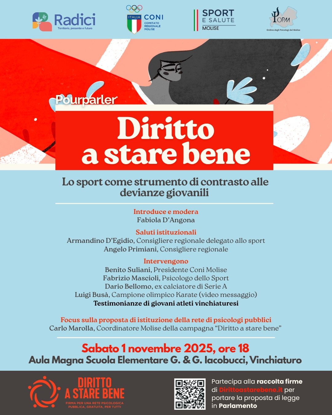 L’iniziativa si svolge con il supporto del Coni Molise, Sport e Salute Molise e dell’Ordine degli psicologi del Molise.