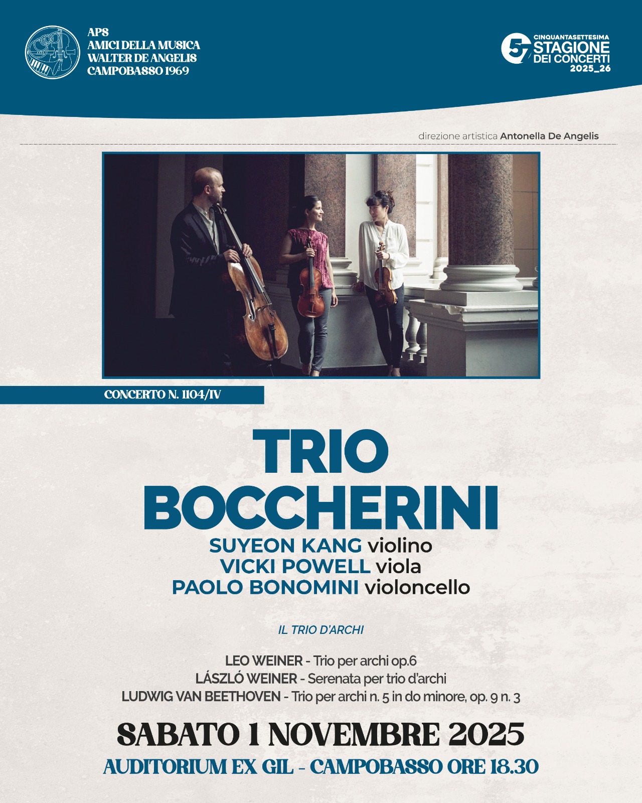 Sabato 1º novembre alle ore 18.30, l’Auditorium Ex Gil ospiterà il Trio Boccherini, ensemble d’eccezione composto da Suyeon Kang (violino), Vicki Powell (viola) e Paolo Bonomini (violoncello).