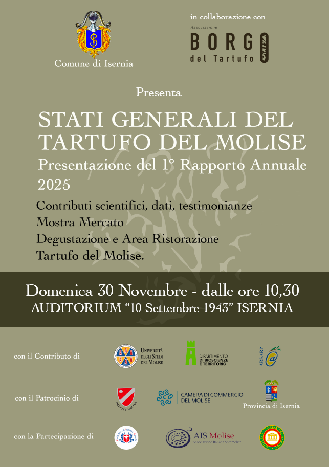 L’iniziativa è promossa dal Comune di Isernia in collaborazione con l’Associazione Borgo del Tartufo e con il patrocinio della Regione Molise, dell’Università degli Studi del Molise, della Camera di Commercio del Molise e dell’ARSAP.