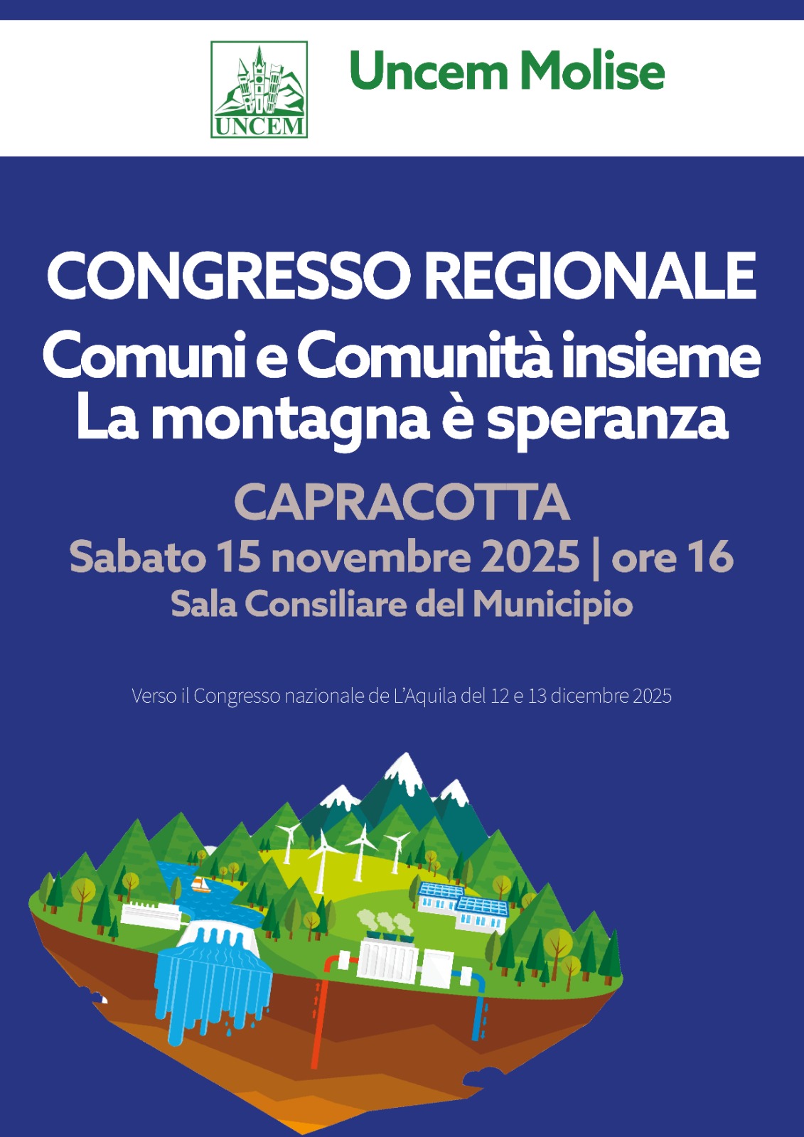 CAPRACOTTA – Si terrà sabato 15 novembre, alle ore 16 presso il Municipio di Capracotta, il Congresso regionale dell’UNCEM Molise, l’Unione Nazionale Comuni, Comunità ed Enti Montani. L’incontro, promosso dalla delegazione regionale guidata da Candido Paglione, sarà un’occasione di confronto tra istituzioni, imprese, associazioni, cittadini e rappresentanti del mondo accademico.