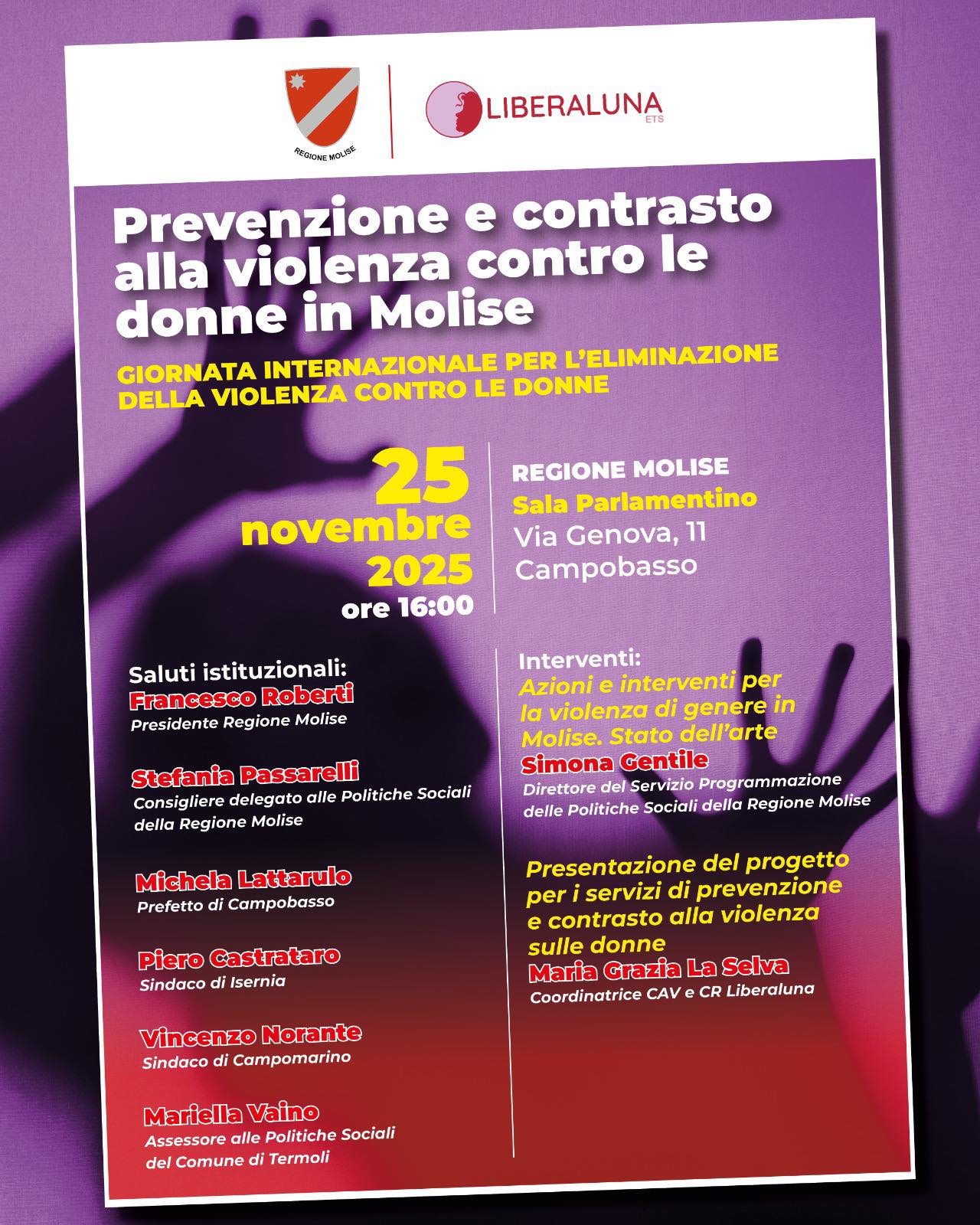 CAMPOBASSO – In occasione della Giornata internazionale per l’eliminazione della violenza contro le donne, domani – 25 novembre alle ore 16 -, nella sala parlamentino della Giunta regionale in via Genova,  si terrà la presentazione del progetto regionale per i servizi di prevenzione e contrasto alla violenza sulle donne il cui ente gestore, a seguito di avviso pubblico, è l’Aps Liberaluna ETS.