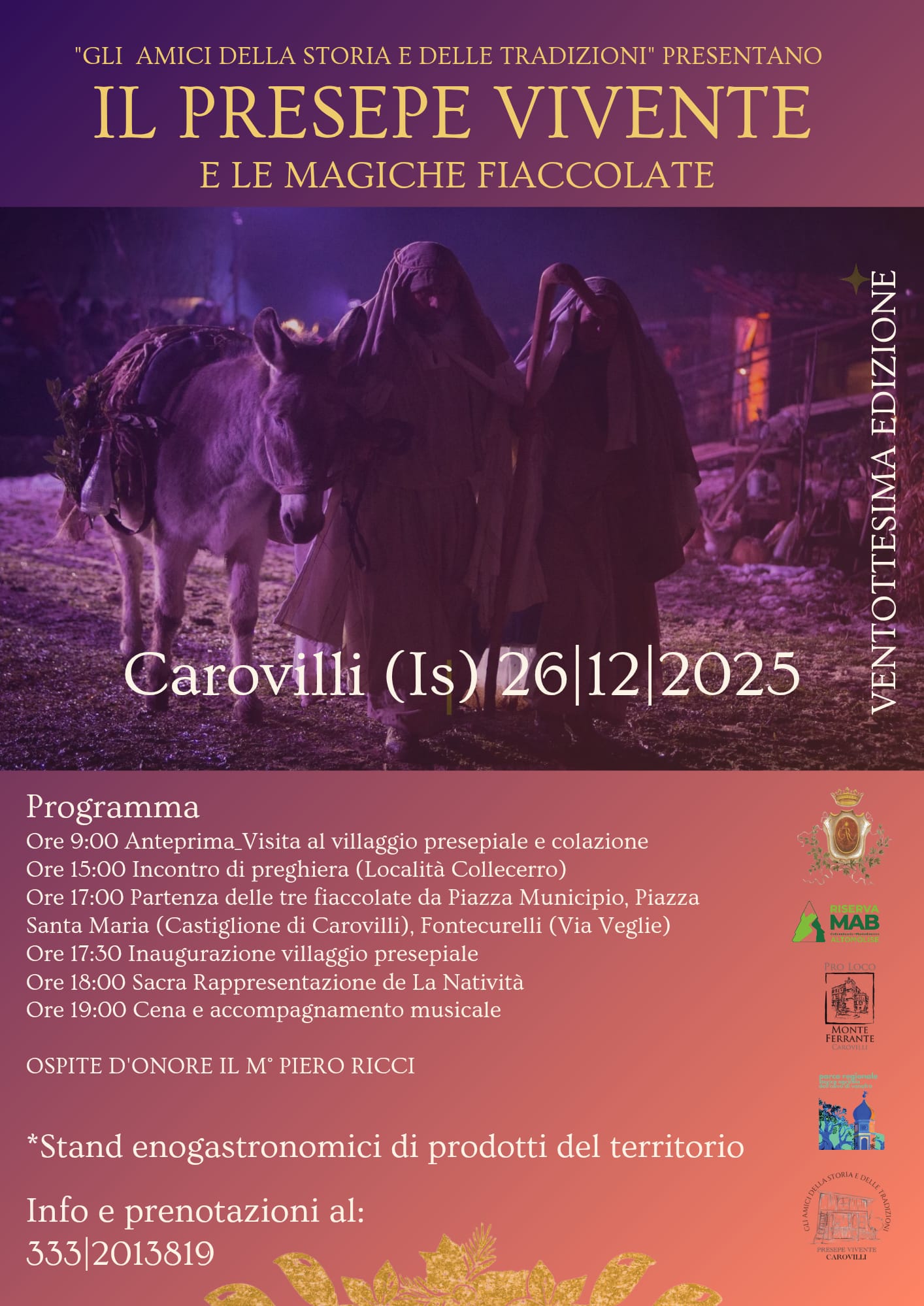 Il 26 dicembre 2025 Carovilli ospiterà il Presepe Vivente e le Magiche Fiaccolate. La manifestazione, giunta alla sua ventottesima edizione, ha come fulcro il villaggio presepiale, un vero e proprio borgo che negli anni si è arricchito di elementi suggestivi e di grande impatto emotivo.