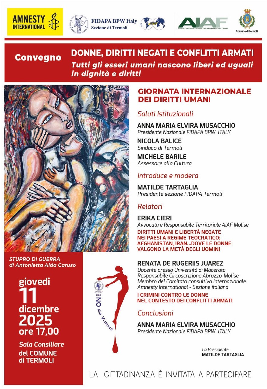 In occasione della Giornata Internazionale dei Diritti Umani, la sezione FIDAPA BPW Italy di Termoli, in collaborazione con Amnesty International, AIAF Molise e il Comune di Termoli, promuove il convegno pubblico dal titolo: Donne, Diritti Negati e Conflitti