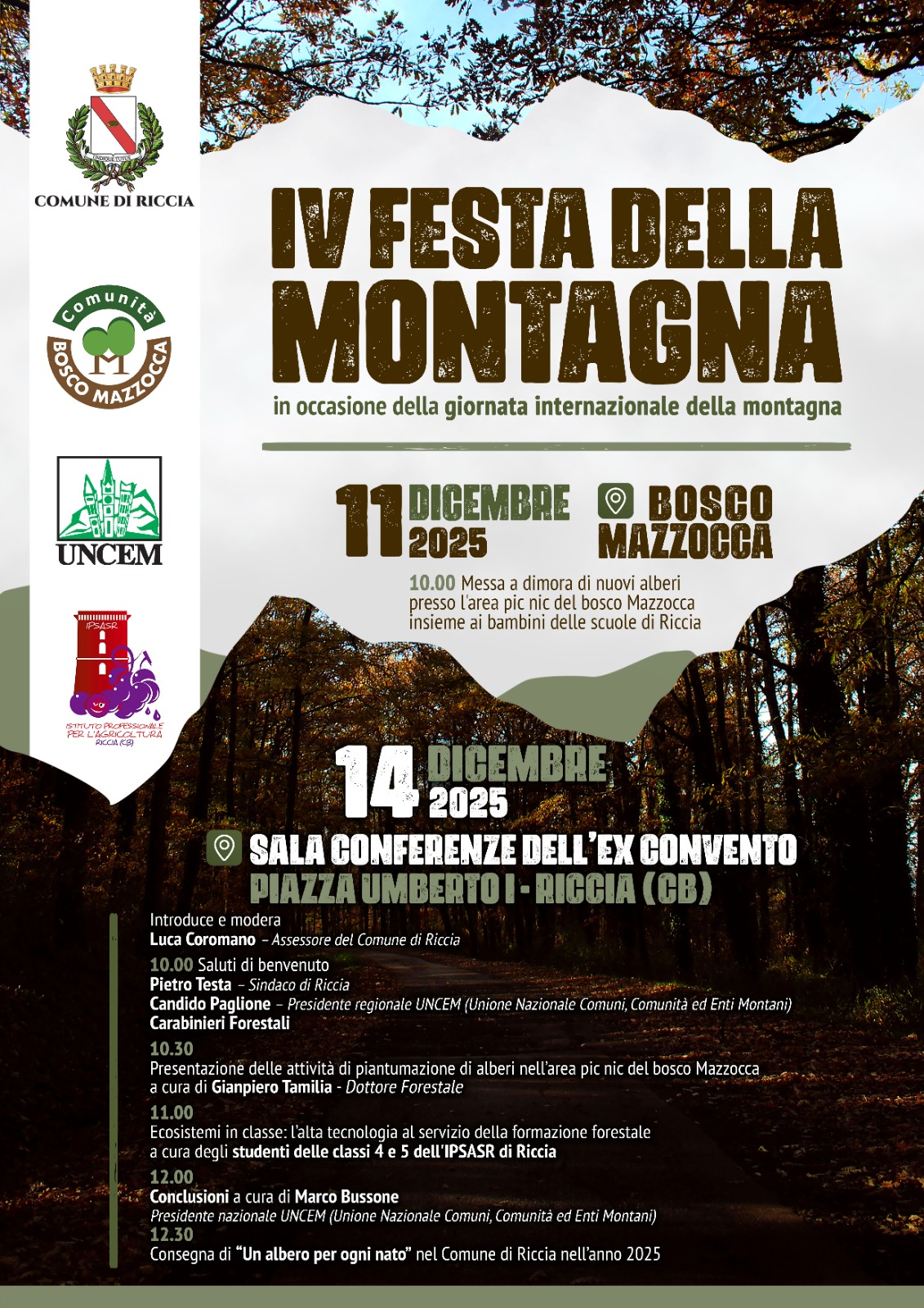 Il Comune di Riccia, in occasione della Giornata Internazionale della Montagna, propone un calendario di iniziative l’11 e il 14 dicembre 2025, tra il Bosco Mazzocca e l’ex Convento di Piazza Umberto I.