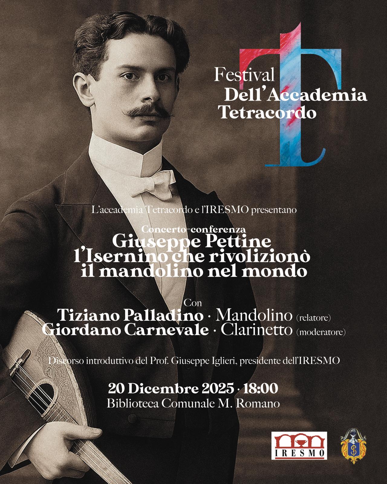 Organizzato dall’Accademia Tetracordo e dall’IRESMO, il concerto-conferenza rende omaggio a Giuseppe Pettine (1874–1966), mandolinista originario di Isernia, celebrato negli Stati Uniti per aver elevato il mandolino a strumento da concerto, ma ancora poco conosciuto nella sua terra natale.