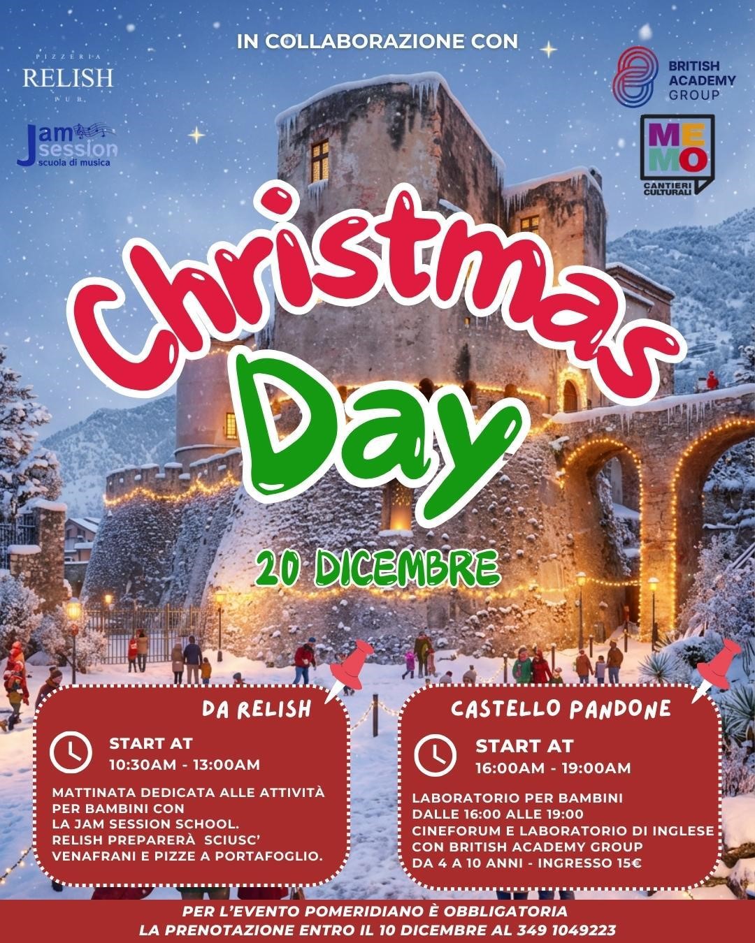 VENAFRO – Una giornata interamente dedicata alla magia del Natale, pensata per i più piccoli ma capace di coinvolgere tutta la comunità: è il “Christmas Day”, in programma il prossimo 20 dicembre tra le atmosfere accoglienti del Relish Pub e il fascino storico del Castello Pandone.