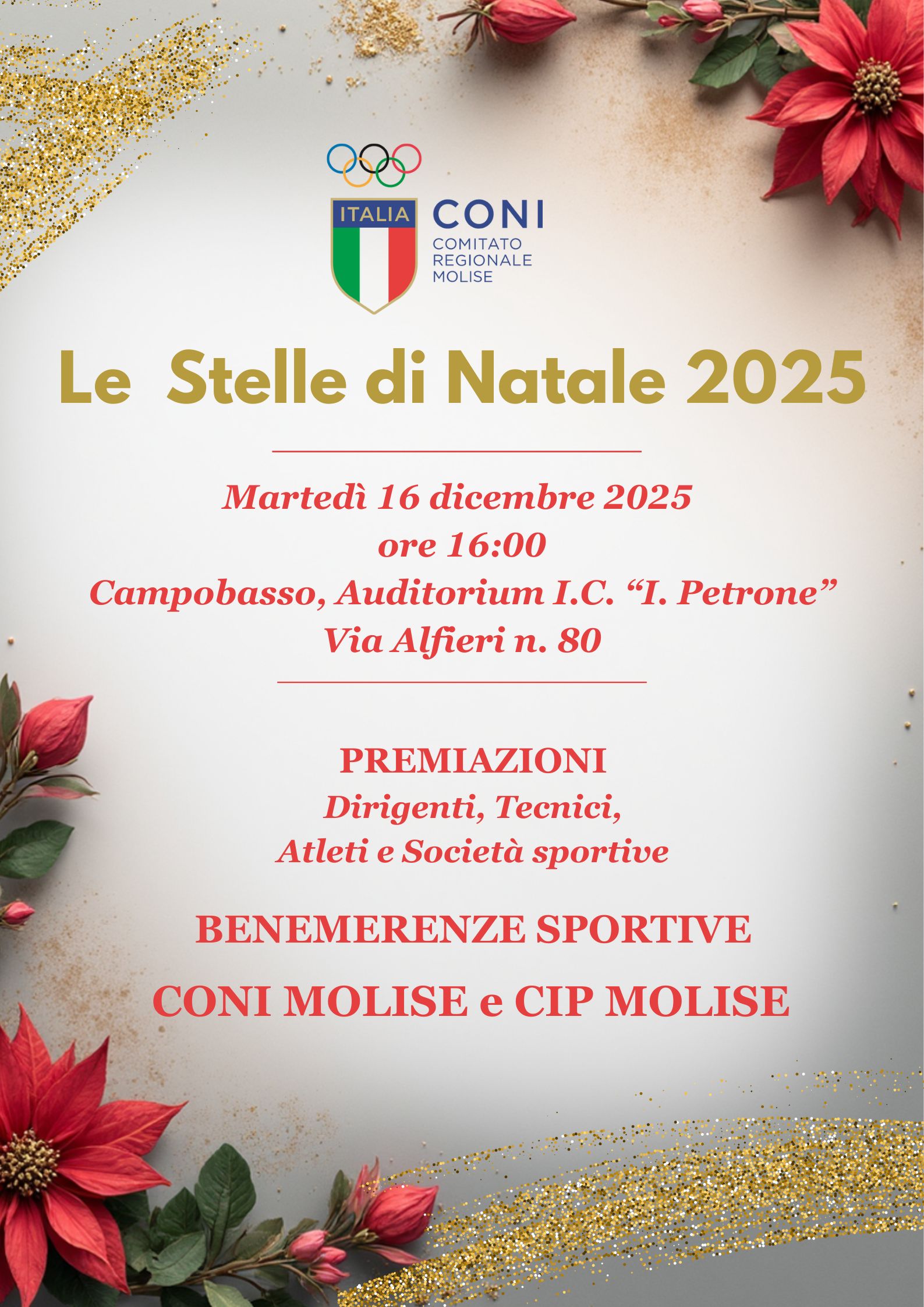 CAMPOBASSO – Il movimento sportivo molisano si prepara a vivere due giornate di festa e riconoscimento con l’edizione 2025 de “Le Stelle di Natale”, iniziativa promossa dal CONI Molise e dedicata agli atleti, ai tecnici, ai dirigenti e alle società che hanno lasciato il segno nel corso dell’anno.