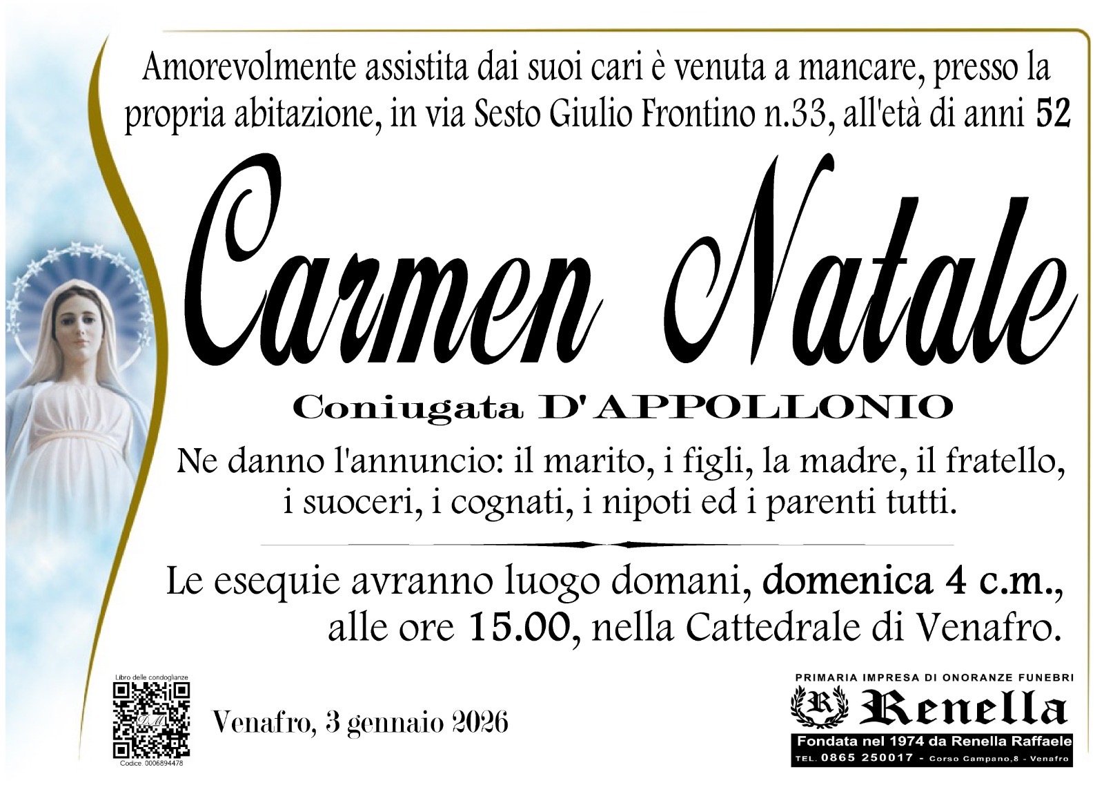 I funerali si terranno domani, 4 gennaio, alle ore 15 presso la Cattedrale: un momento di raccoglimento e memoria per rendere omaggio a una donna che, con discrezione e forza, è stata esempio di umanità e compostezza.