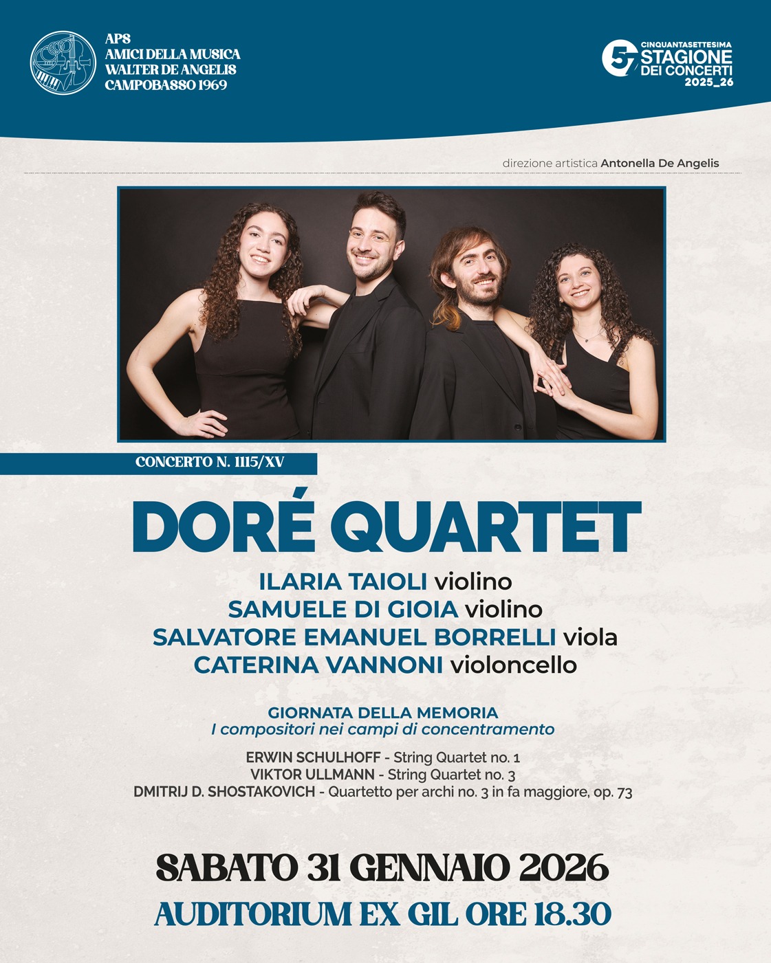 L’evento, organizzato in occasione della Giornata della Memoria, vedrà protagonista il Doré Quartet, giovane ensemble cameristico di caratura internazionale, che interpreterà tre opere di straordinario valore storico e musicale: il Quartetto per archi n. 1 di Erwin Schulhoff, compositore boemo di origine ebraica morto nel campo di Wülzburg; il Quartetto n. 3 di Viktor Ullmann, scritto a Terezín poco prima della deportazione ad Auschwitz, dove fu assassinato nel 1944; e il Quartetto per archi n. 3 in fa maggiore, op. 73 di Dmitrij Shostakovich, testimonianza intensa delle contraddizioni e delle ferite dell’Europa novecentesca.