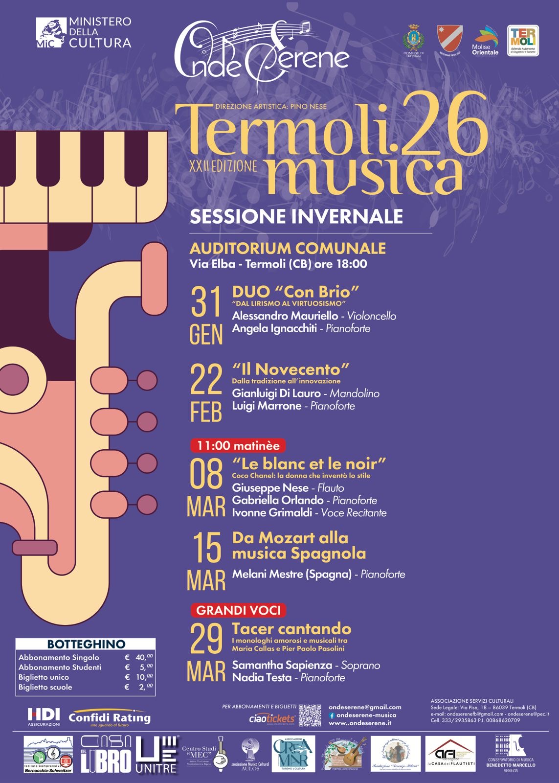 La grande musica torna protagonista sulla costa molisana con la sessione invernale della XXII edizione di Termoli Musica 2026. La rassegna, organizzata dall’Associazione Servizi Culturali “Ondeserene”, si svolgerà dal 31 gennaio al 29 marzo presso l’Auditorium Comunale di via Elba, con il sostegno del Ministero della Cultura (FNSV), del Comune di Termoli, della Regione Molise e dell’Azienda Autonoma di Soggiorno e Turismo.