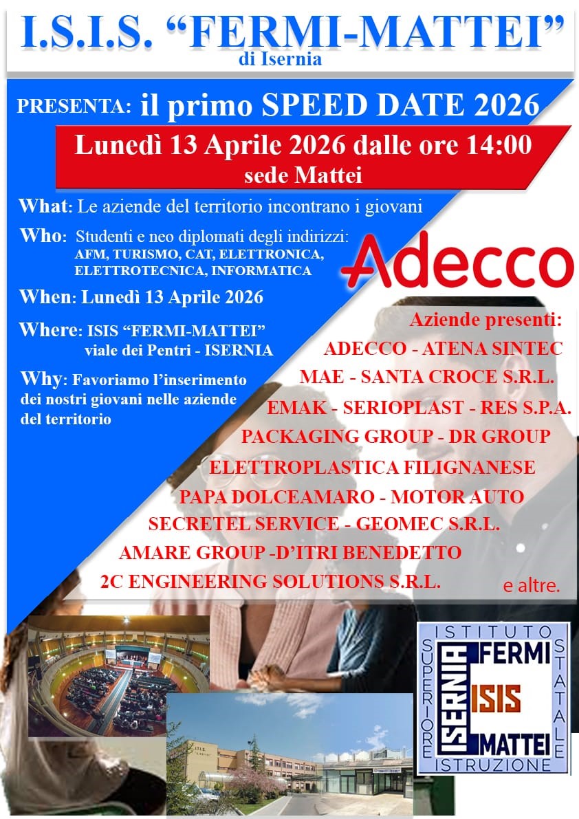 ISERNIA – L’Istituto Statale di Istruzione Superiore “Fermi–Mattei” organizza il suo primo Speed Date 2026, un pomeriggio dedicato all’incontro diretto tra studenti, famiglie e aziende del territorio.